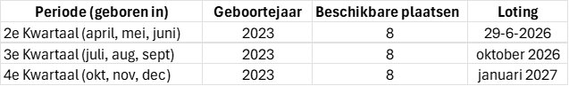 Nog niet ingevulde plaatsen in een kwartaal kunnen op basis van de voorrangsregels opgevuld worden met leerlingen van de wachtlijst van een voorgaand kwartaal. Per kwartaal houden we na de loting maximaal 2 wachtlijst-plaatsen aan. Ouders dienen zelf aan te geven een wachtlijstplek aan te willen houden. Alleen indien er in het volgend kwartaal minder leerlingen dan het beschikbare aantal plaatsen aangemeld zijn, kan er ruimte ontstaan voor het plaatsen van leerlingen die op deze wachtlijst staan.